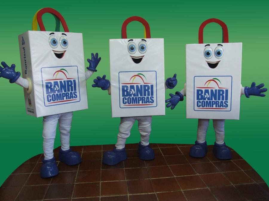 Bonecos mascotes desenvolvidos para promover os serviços do Banco Banrisul em feiras e eventos.