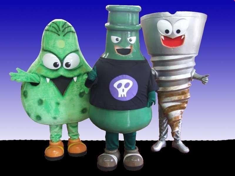 Bonecos fantasia, mascotes de campanha do SESC dos perigos biológico (bactéria), químico (garrafa) e físico (prego)