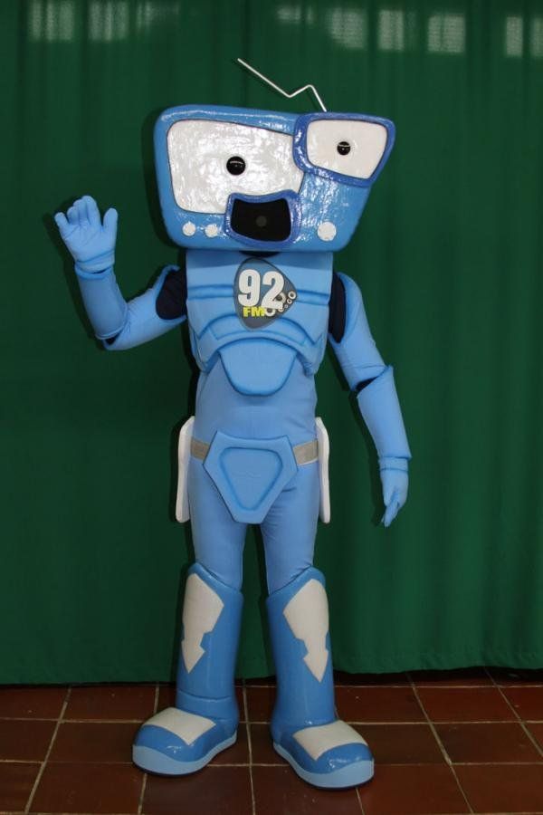 Boneco mascote de robô confeccionado para eventos da Rádio 92 FM.